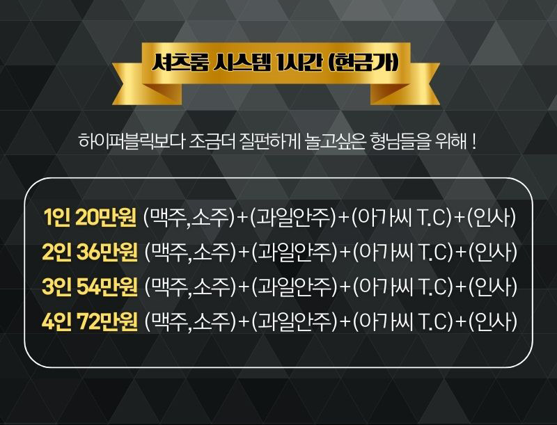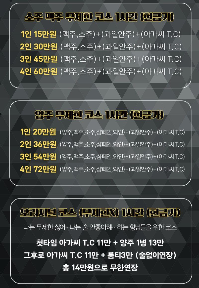 이런 이유로 처음 방문하는 손님들은 다소 당황하기도 합니다. 하지만 기본적인 구조를 이해하고 나면 생각보다 간단합니다. 주대는 일종의 입장료 개념으로, 몇 시간 단위 혹은 인원수에 따라 정해지고, 룸 비용은 따로 책정되는 경우가 많습니다.